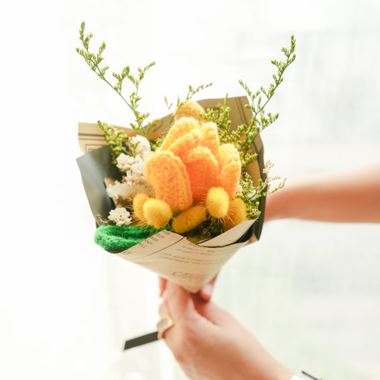 onion vase with yellow crochet tulip