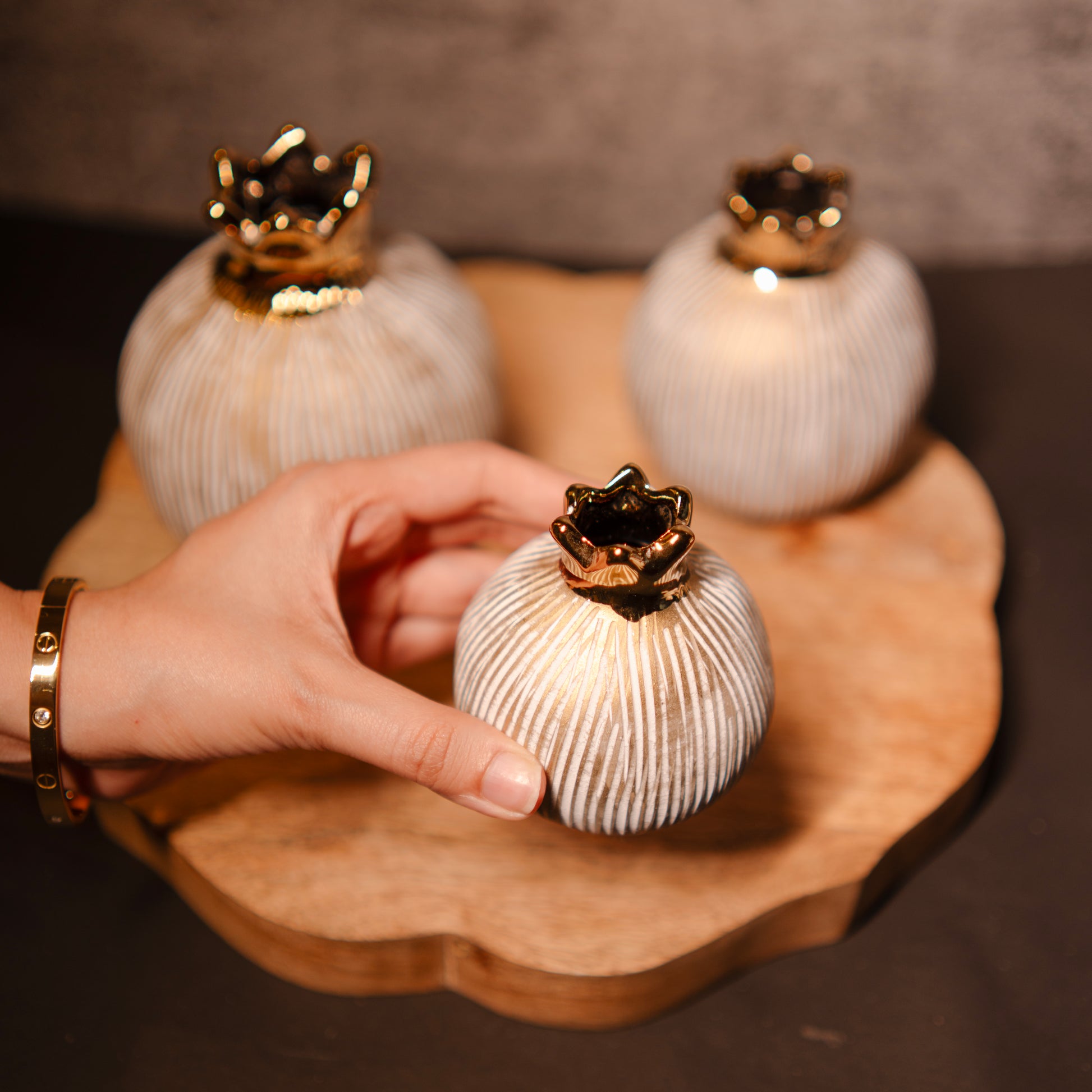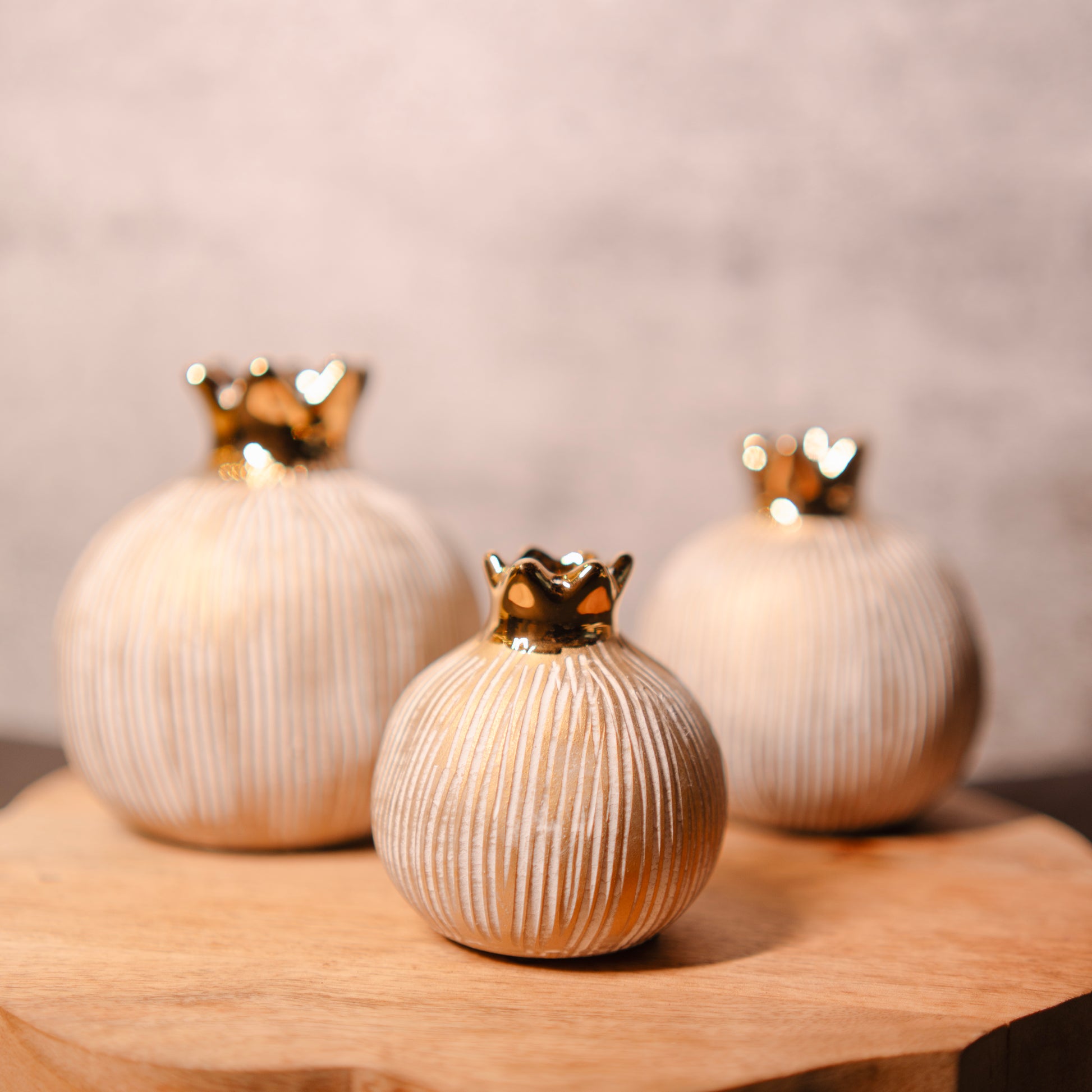 The set typically features intricate designs inspired by the pomegranate fruit, symbolizing abundance, prosperity, and fertility in various cultures. These vases may be adorned with rich, jewel-like colors such as deep reds, golds, and greens, reflecting the vibrant, lush hues found in a pomegranate.